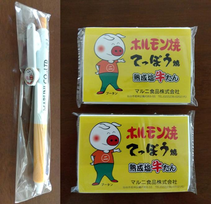 過日、某週末びっくり市で買い物をしていたところ、思 いがけずなかなかにレアなグッズを手に入れることがで きた。 それがこの、マルニ食品のボールペンとポケットティッ シュだっ! このマルニ食品、宮城県内のスーパー等ならどこでも? 置いてある味付け生ホルモン『てっぽう』などの商品で 県民ならば知らぬ人はいないほどの存在であり、お馴染 みの豚のキャラクターもつい数年前まではテレビCMでよ く見かけていたように思う。 一方で、出自が宮城県ではない自分はこの豚のキャラク ターに「ブータン」なる名前があることも今回ポケット ティッシュをもらって初めて知った訳だが、これには現 ブータン国王のジグミ・ケサル・ナムゲル・ワンチュク 陛下もさぞびっくりだろう。 さぁキミも、宮城県に来たら『てっぽう』や『ねぎ塩ホ ルモン』をはじめとするマルニ食品の商品をたくさん購 入して、それでもボールペンなどグッズはもらえないと いう現実に打ちひしがれてみないか?! |